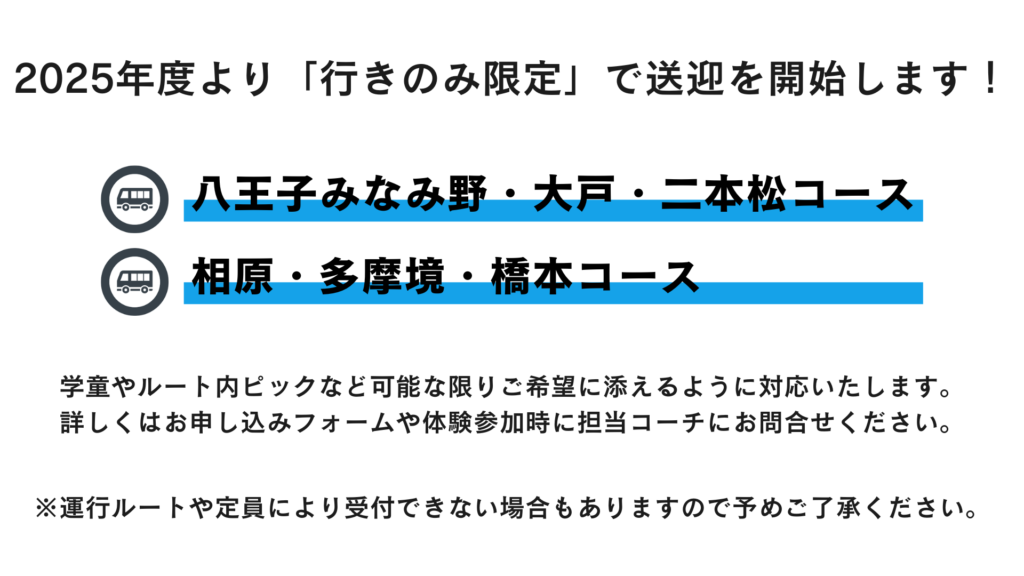 ございます。悪天候などで中止となった場合は別の曜日に振替を行います。振替に参加できなかった場合は別のクラスで消化していただき、月平均4回(夏休みと冬休みを除く)の活動となるように調整します。
