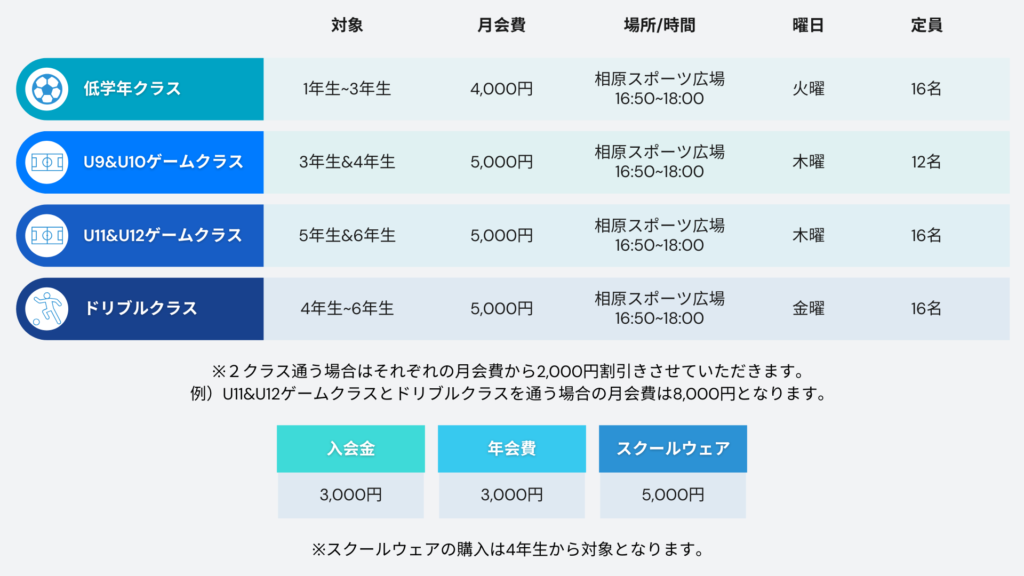 時期により新規入会キャンペーンやジュニアユースに入会する際の入会金の割引および免除を行っております。